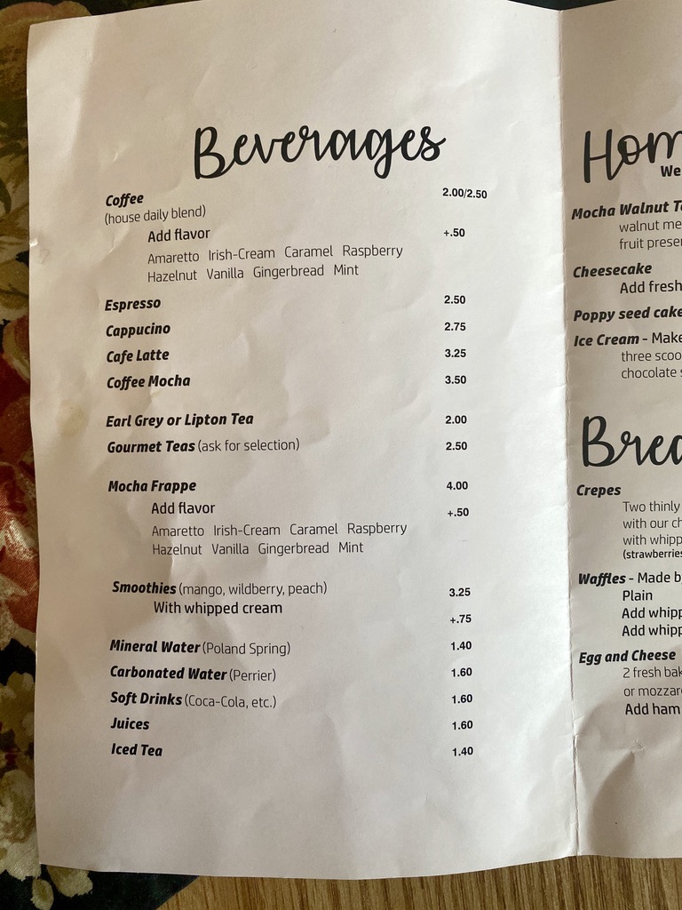 - Other Food Items: The menu includes sweet and savory options like waffles, crepes, egg and cheese dishes, as well as a selection of desserts including cheesecake, poppy seed cake, mocha walnut treats, and ice cream.